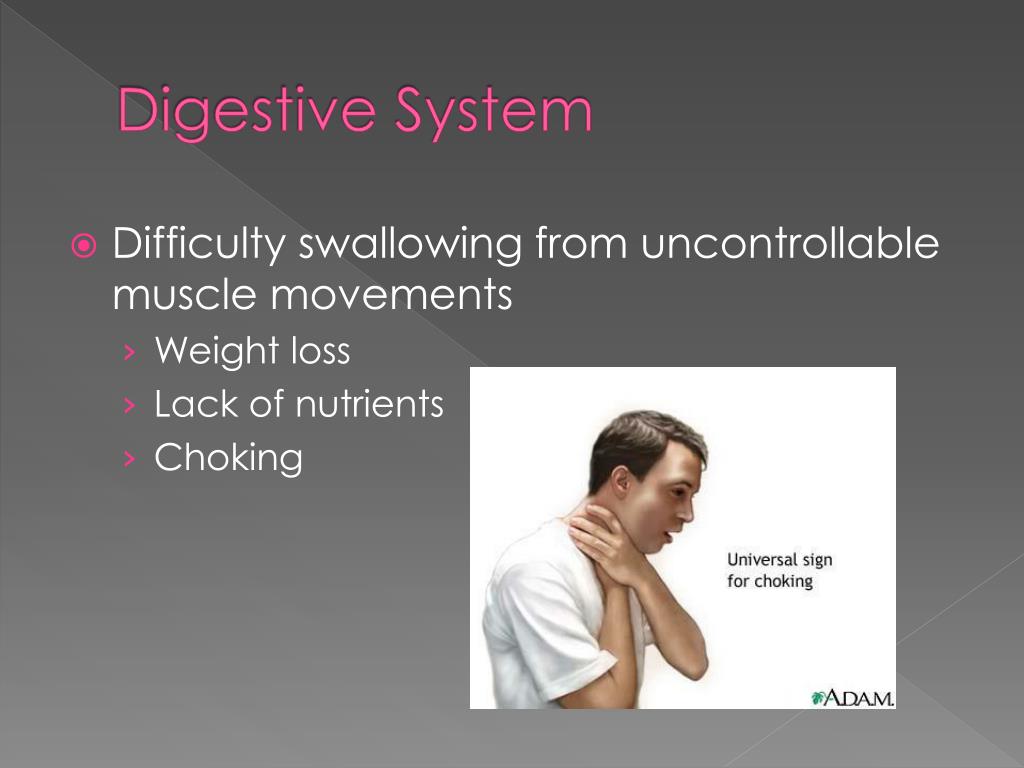 Digestive System • Difficulty swallowing from uncontrollable muscle movements • Weight loss • Lack of nutrients • Choking
