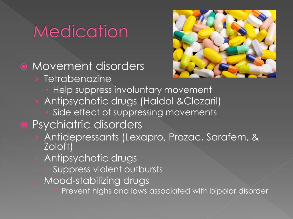 Medication • Movement disorders • Tetrabenazine • Help suppress involuntary movement • Antipsychotic drugs (Haldol &Clozaril) • Side effect of suppressing movements • Psychiatric disorders • Antidepressants (Lexapro, Prozac, Sarafem, & Zoloft) • Antipsychotic drugs • Suppress violent outbursts • Mood-stabilizing drugs • Prevent highs and lows associated with bipolar disorder