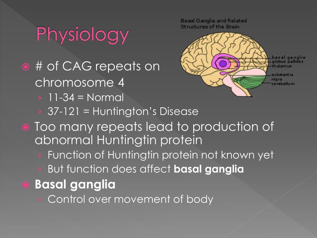 Physiology • # of CAG repeats on chromosome 4 • 11-34 = Normal • 37-121 = Huntington’s Disease • Too many repeats lead to production of abnormal Huntingtin protein • Function of Huntingtin protein not known yet • But function does affect basal ganglia • Basal ganglia • Control over movement of body