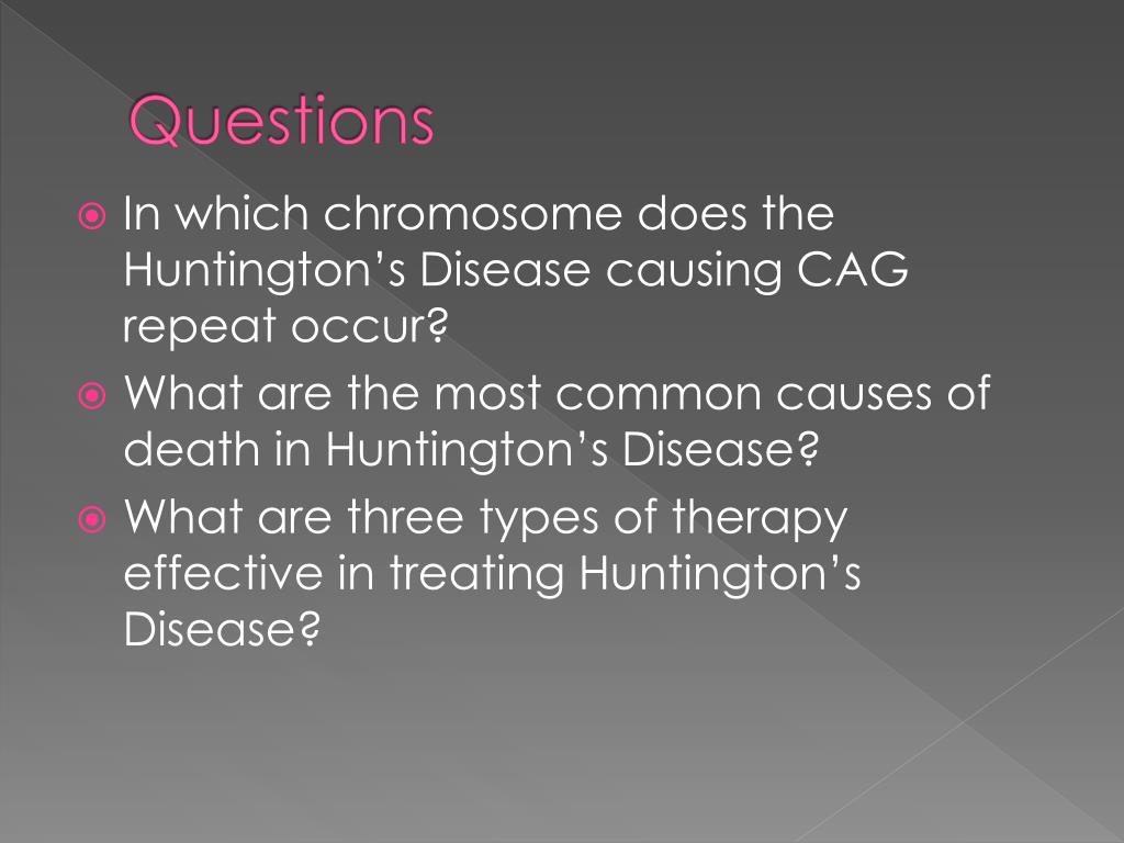 Questions • In which chromosome does the Huntington’s Disease causing CAG repeat occur? • What are the most common causes of death in Huntington’s Disease? • What are three types of therapy effective in treating Huntington’s Disease?