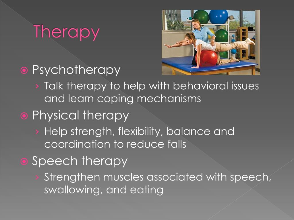 Therapy • Psychotherapy • Talk therapy to help with behavioral issues and learn coping mechanisms • Physical therapy • Help strength, flexibility, balance and coordination to reduce falls • Speech therapy • Strengthen muscles associated with speech, swallowing, and eating