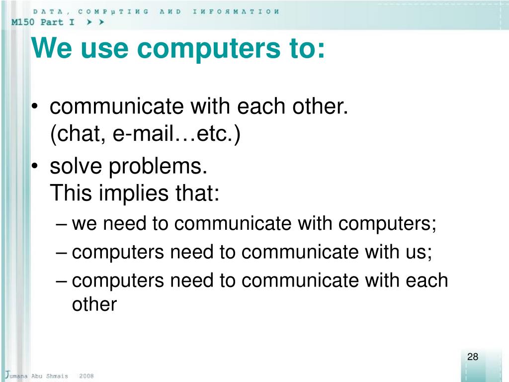 We use computers to: • communicate with each other. (chat, e-mail…etc.) • solve problems. This implies that: • we need to communicate with computers; • computers need to communicate with us; • computers need to communicate with each other