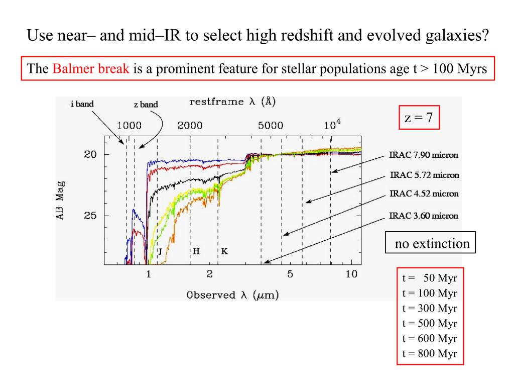 Use near– and mid–IR to select high redshift and evolved galaxies? The Balmer break is a prominent feature for stellar populations age t > 100 Myrs z = 7 no extinction t = 50 Myr t = 100 Myr t = 300 Myr t = 500 Myr t = 600 Myr t = 800 Myr