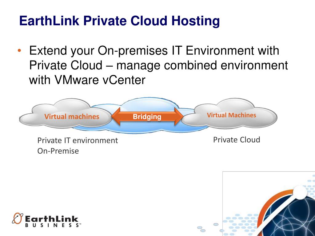 EarthLink Private Cloud Hosting • Extend your On-premises IT Environment with Private Cloud – manage combined environment with VMware vCenter Bridging Virtual Machines Virtual machines Private Cloud Private IT environment On-Premise