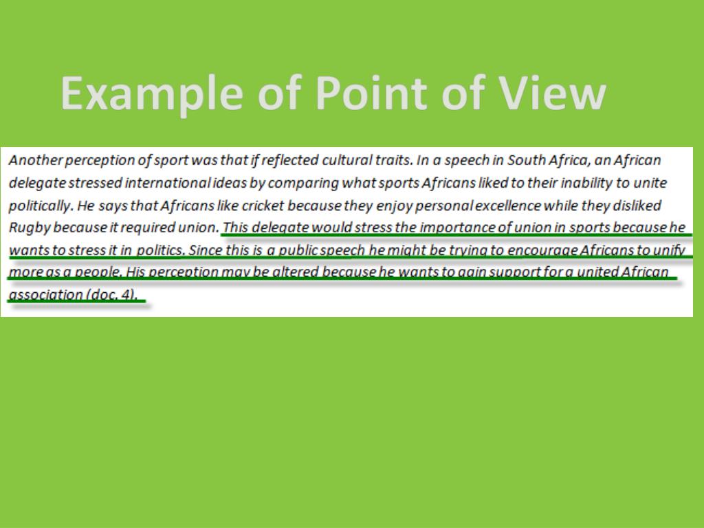 Point of View must be analysis and not just a statement WHO/WHAT says it… WHAT does he/she say (this could be used as evidence to support your thesis) WHY does he/she say it (this is the POV and this is where you get POV points.