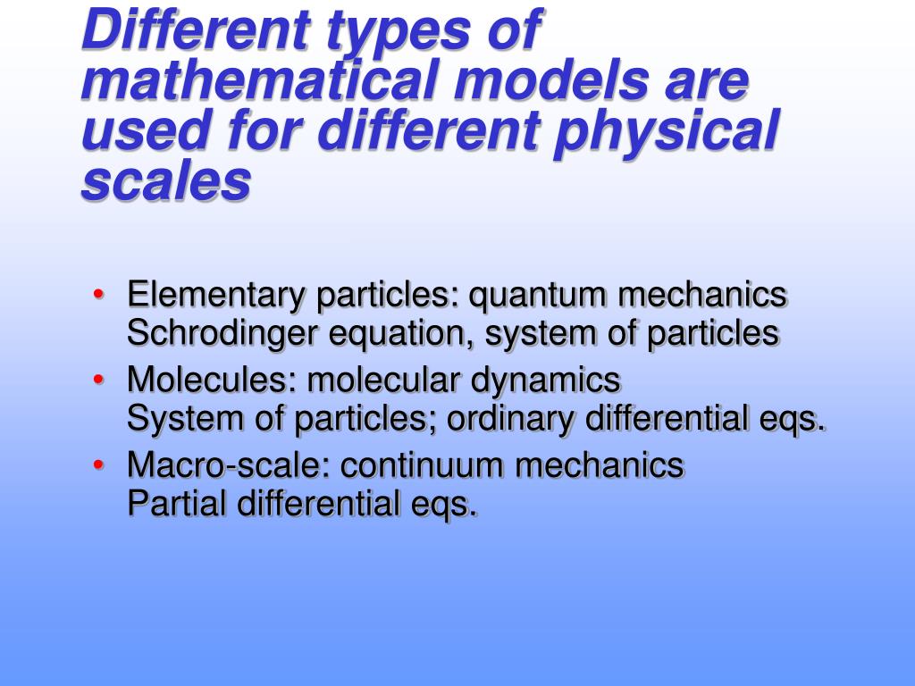 Different types of mathematical models are used for different physical scales • Elementary particles: quantum mechanics Schrodinger equation, system of particles • Molecules: molecular dynamics System of particles; ordinary differential eqs. • Macro-scale: continuum mechanics Partial differential eqs.