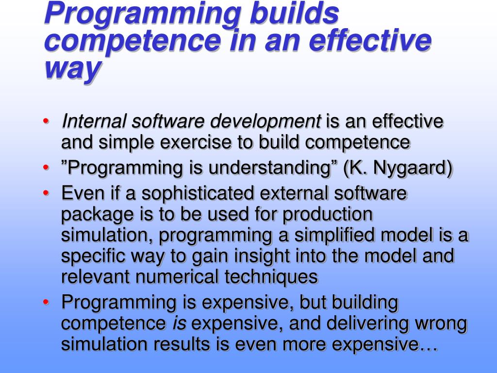 Programming builds competence in an effective way • Internal software development is an effective and simple exercise to build competence • ”Programming is understanding” (K. Nygaard) • Even if a sophisticated external software package is to be used for production simulation, programming a simplified model is a specific way to gain insight into the model and relevant numerical techniques • Programming is expensive, but building competence is expensive, and delivering wrong simulation results is even more expensive…