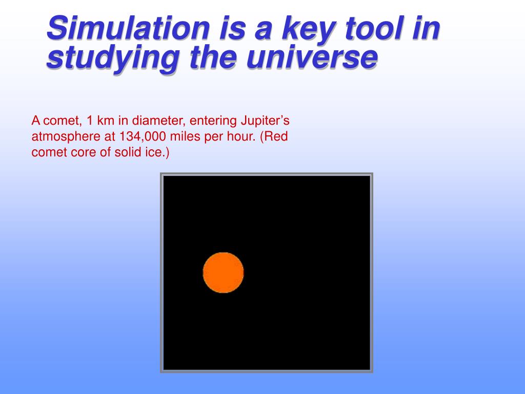 Simulation is a key tool in studying the universe A comet, 1 km in diameter, entering Jupiter’s atmosphere at 134,000 miles per hour. (Red comet core of solid ice.)