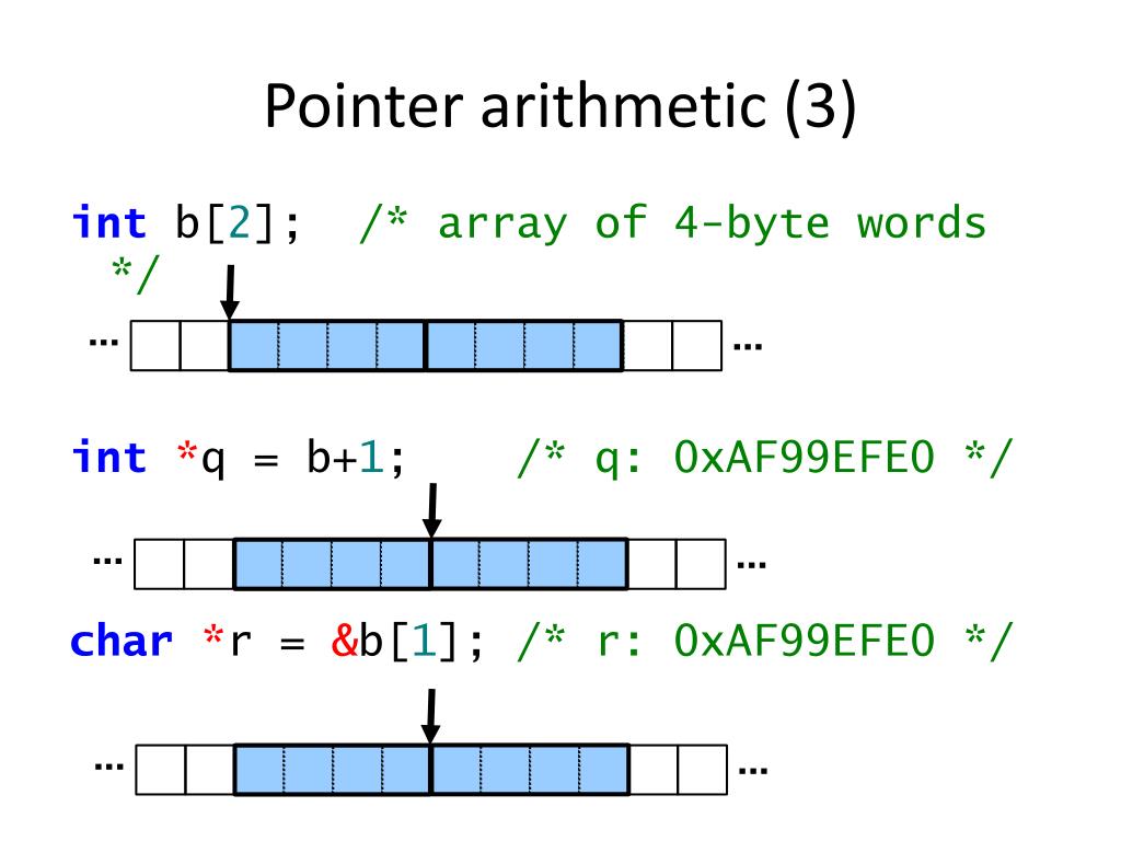 ... ... ... ... ... ... Pointer arithmetic (3) int b[2]; /* array of 4-byte words */ int*q = b+1; /* q: 0xAF99EFE0 */ char*r = &b[1]; /* r: 0xAF99EFE0 */
