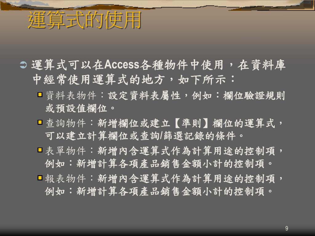 運算式的使用 • 運算式可以在Access各種物件中使用,在資料庫中經常使用運算式的地方,如下所示: • 資料表物件:設定資料表屬性,例如:欄位驗證規則或預設值欄位。 • 查詢物件:新增欄位或建立【準則】欄位的運算式,可以建立計算欄位或查詢/篩選記錄的條件。 • 表單物件:新增內含運算式作為計算用途的控制項,例如:新增計算各項產品銷售金額小計的控制項。 • 報表物件:新增內含運算式作為計算用途的控制項,例如:新增計算各項產品銷售金額小計的控制項。