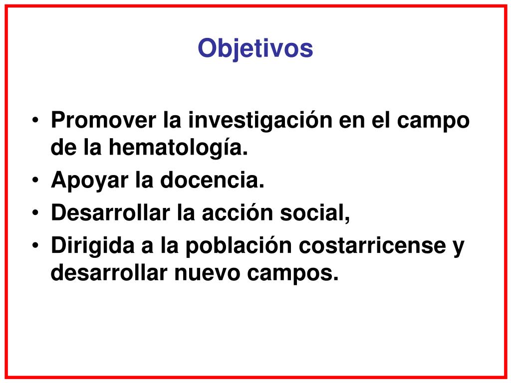 Objetivos • Promover la investigación en el campo de la hematología. • Apoyar la docencia. • Desarrollar la acción social, • Dirigida a la población costarricense y desarrollar nuevo campos.