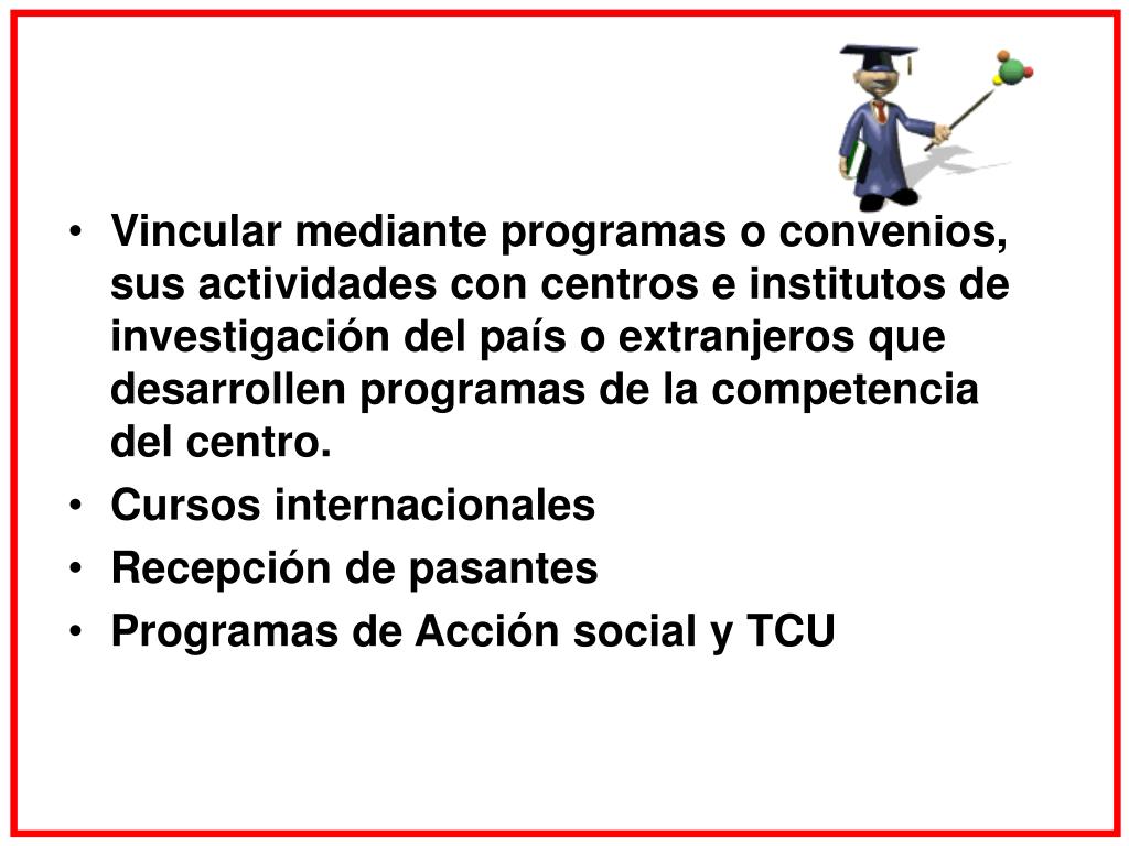 Vincular mediante programas o convenios, sus actividades con centros e institutos de investigación del país o extranjeros que desarrollen programas de la competencia del centro. • Cursos internacionales • Recepción de pasantes • Programas de Acción social y TCU
