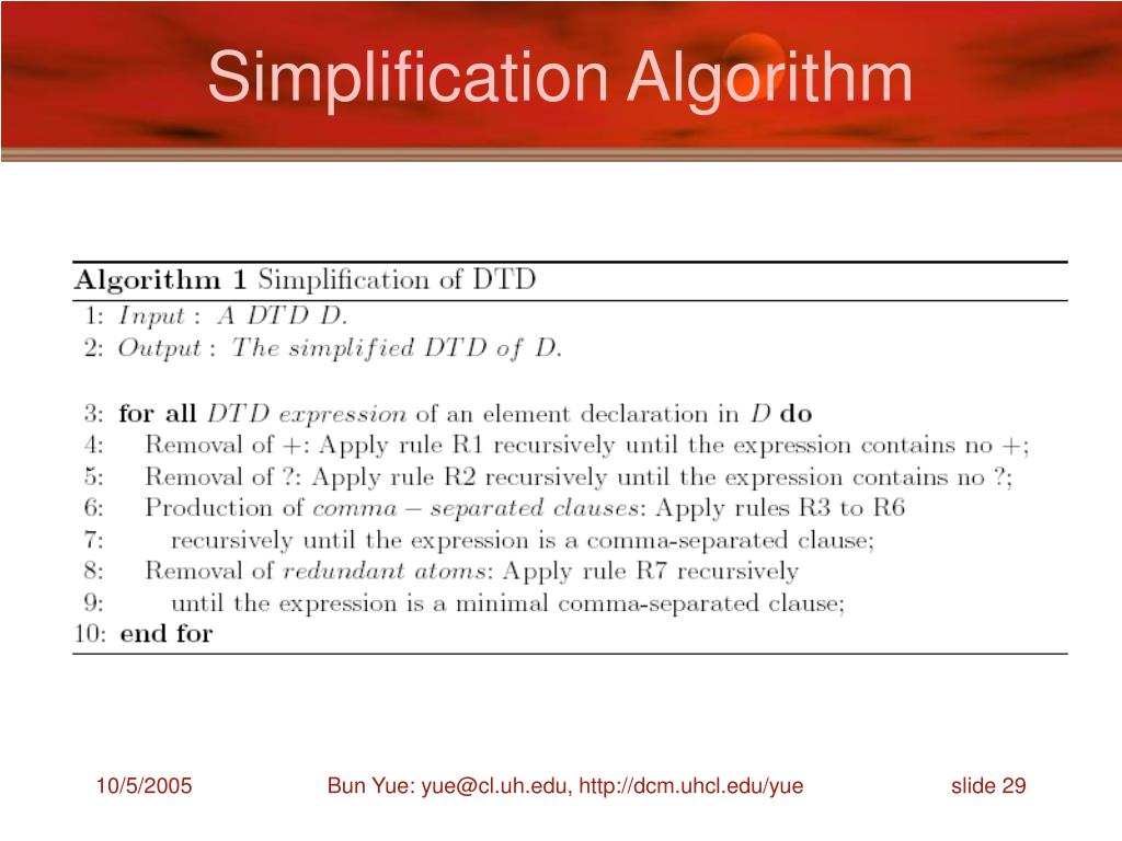 Advantages • Complete: handle all DTDs. • Optimal: in the sense that * will not be generated if not needed. Example 5: <!ELEMENT a (b,((b+,c)|(d,b*,c?)),(e*,f)?)> => <!ELEMENT a (b*,c,d,e*,f)> Bun Yue: yue@cl.uh.edu, http://dcm.uhcl.edu/yue