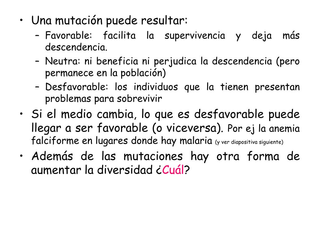 Una mutación puede resultar: • Favorable: facilita la supervivencia y deja más descendencia. • Neutra: ni beneficia ni perjudica la descendencia (pero permanece en la población) • Desfavorable: los individuos que la tienen presentan problemas para sobrevivir • Si el medio cambia, lo que es desfavorable puede llegar a ser favorable (o viceversa). Por ej la anemia falciforme en lugares donde hay malaria (y ver diapositiva siguiente) • Además de las mutaciones hay otra forma de aumentar la diversidad ¿Cuál?