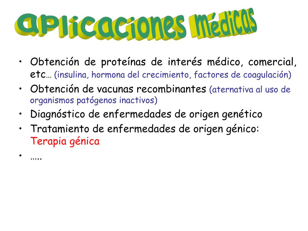 aplicaciones médicas • Obtención de proteínas de interés médico, comercial, etc… (insulina, hormona del crecimiento, factores de coagulación) • Obtención de vacunas recombinantes (aternativa al uso de organismos patógenos inactivos) • Diagnóstico de enfermedades de origen genético • Tratamiento de enfermedades de origen génico: Terapia génica • …..