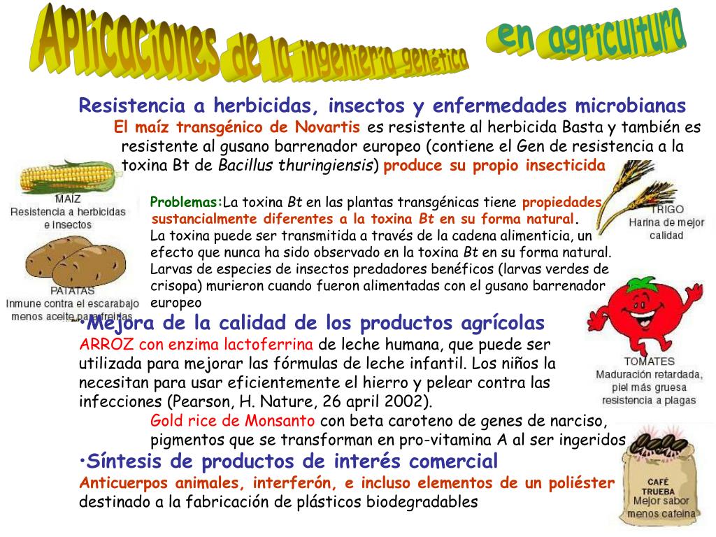 en agricultura Aplicaciones de la ingeniería genética • Resistencia a herbicidas, insectos y enfermedades microbianas • El maíz transgénico de Novartises resistente al herbicida Basta y también es • resistente al gusano barrenador europeo (contiene el Gen de resistencia a la • toxina Bt de Bacillus thuringiensis)produce su propio insecticida • Problemas:La toxina Bt en las plantas transgénicas tienepropiedades • sustancialmentediferentes a la toxina Bt en su forma natural. • La toxina puede ser transmitida a través de la cadena alimenticia, un • efecto que nunca ha sido observado en la toxina Bt en su forma natural. • Larvas de especies de insectos predadores benéficos (larvas verdes de • crisopa) murieron cuando fueron alimentadas con el gusano barrenador • europeo • Mejora de la calidad de los productos agrícolas • ARROZ con enzima lactoferrina de leche humana, que puede ser • utilizada para mejorar las fórmulas de leche infantil. Los niños la • necesitan para usar eficientemente el hierro y pelear contra las • infecciones(Pearson, H. Nature, 26 april 2002). • Gold rice de Monsanto con beta caroteno de genes de narciso, • pigmentos que se transforman en pro-vitamina A al ser ingeridos • Síntesis de productos de interés comercial • Anticuerpos animales, interferón, e incluso elementos de un poliéster • destinado a la fabricación de plásticos biodegradables