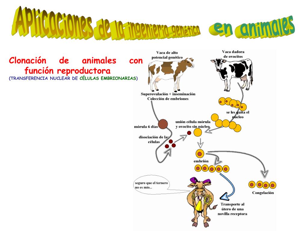 Aplicaciones de la ingeniería genética en animales Clonación de animales con función reproductora (TRANSFERENCIA NUCLEAR DE CÉLULAS EMBRIONARIAS)