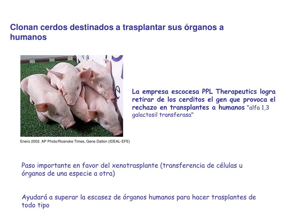 Clonan cerdos destinados a trasplantar sus órganos a humanos La empresa escocesa PPL Therapeutics logra retirar de los cerditos el gen que provoca el rechazo en transplantes a humanos"alfa 1,3 galactosil transferasa" Enero 2002. AP Photo/Roanoke Times, Gene Dalton (IDEAL-EFE) Paso importante en favor del xenotrasplante (transferencia de células u órganos de una especie a otra) Ayudará a superar la escasez de órganos humanos para hacer trasplantes de todo tipo