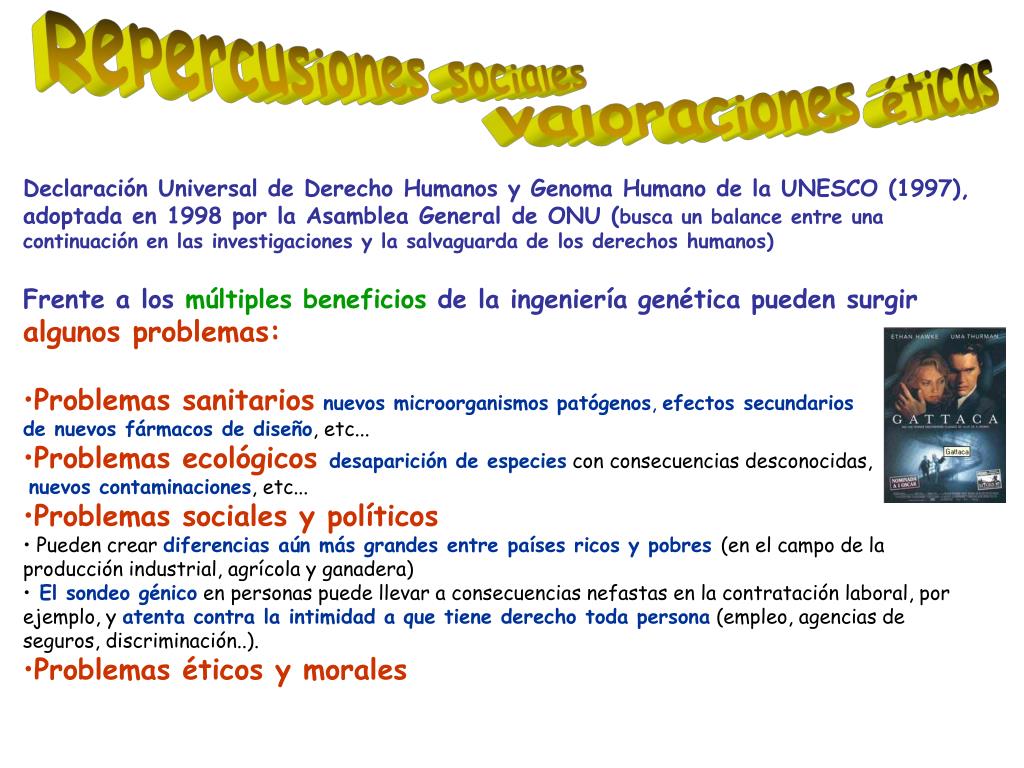 Repercusiones sociales valoraciones éticas • Declaración Universal de Derecho Humanos y Genoma Humano de la UNESCO (1997), adoptada en 1998 por la Asamblea General de ONU (busca un balance entre una continuación en las investigaciones y la salvaguarda de los derechos humanos) • Frente a los múltiples beneficios de la ingeniería genética pueden surgir algunos problemas: • Problemas sanitariosnuevos microorganismos patógenos,efectos secundarios • de nuevos fármacos de diseño, etc... • Problemas ecológicos desaparición de especies con consecuencias desconocidas, • nuevos contaminaciones, etc... • Problemas sociales y políticos • Pueden crear diferencias aún más grandes entre países ricos y pobres (en el campo de la producción industrial, agrícola y ganadera), • El sondeo génico en personas puede llevar a consecuencias nefastas en la contratación laboral, por ejemplo, y atenta contra la intimidad a que tiene derecho toda persona (empleo, agencias de seguros, discriminación..). • Problemas éticos y morales
