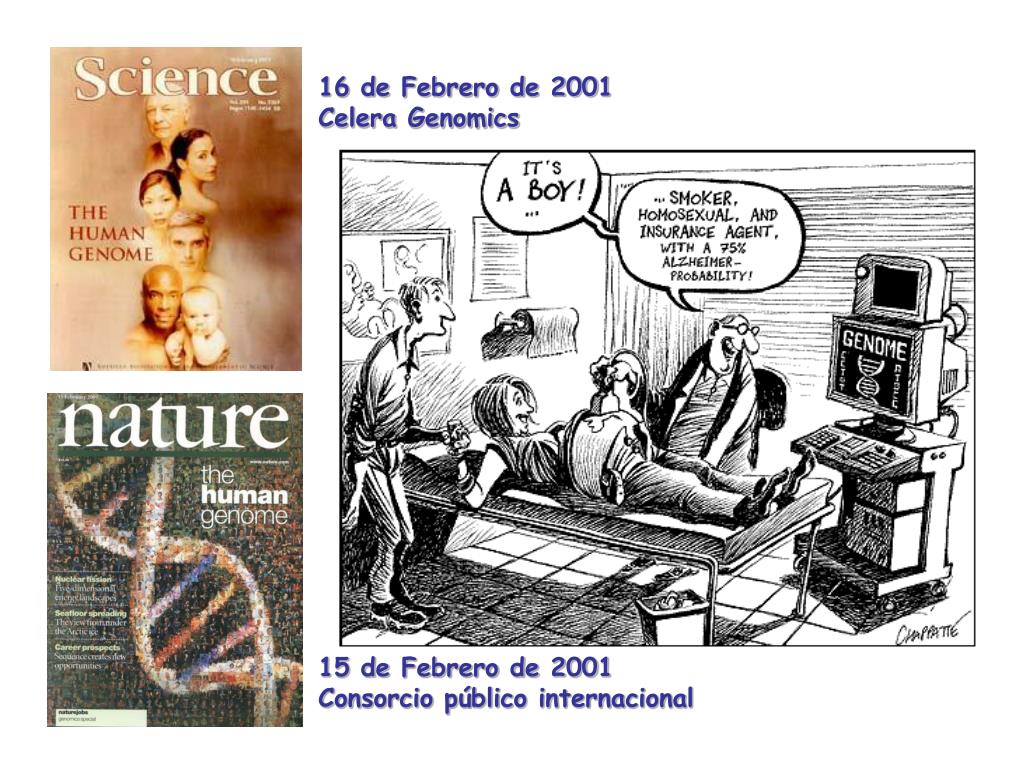 16 de Febrero de 2001 Celera Genomics Proyecto genoma humano La secuencia del genoma es un atajo valioso: ayuda a los científicos a encontrar los genes más fácil y rápidamente y sienta las bases para averiguar la función de los genes identificados • Beneficios médicos tras el conocimiento de la estructura de cada gen humano • Diagnóstico en individuos con riesgo de ser portadores del gen de alguna enfermedad • Marco de trabajo para el desarrollo de nuevas terapias, además de nuevas estrategias para la terapia génica 15 de Febrero de 2001 Consorcio público internacional