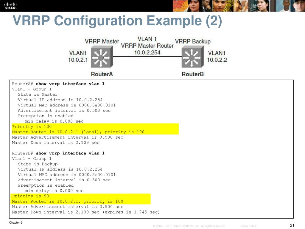 VRRP Configuration Example (2) RouterA# show vrrp interface vlan 1 Vlan1 - Group 1 State is Master Virtual IP address is 10.0.2.254 Virtual MAC address is 0000.5e00.0101 Advertisement interval is 0.500 sec Preemption is enabled min delay is 0.000 sec Priority is 100 Master Router is 10.0.2.1 (local), priority is 100 Master Advertisement interval is 0.500 sec Master Down interval is 2.109 sec RouterB# show vrrp interface vlan 1 Vlan1 - Group 1 State is Backup Virtual IP address is 10.0.2.254 Virtual MAC address is 0000.5e00.0101 Advertisement interval is 0.500 sec Preemption is enabled min delay is 0.000 sec Priority is 90 Master Router is 10.0.2.1, priority is 100 Master Advertisement interval is 0.500 sec Master Down interval is 2.109 sec (expires in 1.745 sec)