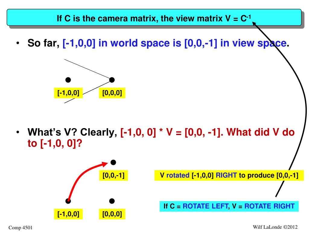 If C is the camera matrix, the view matrix V = C-1 • So far, [-1,0,0] in world space is [0,0,-1] in view space. • What’s V? Clearly, [-1,0, 0] * V = [0,0, -1]. What did V do to [-1,0, 0]? [-1,0,0] [0,0,0] [0,0,-1] V rotated [-1,0,0] RIGHT to produce [0,0,-1] If C = ROTATE LEFT, V = ROTATE RIGHT [-1,0,0] [0,0,0]