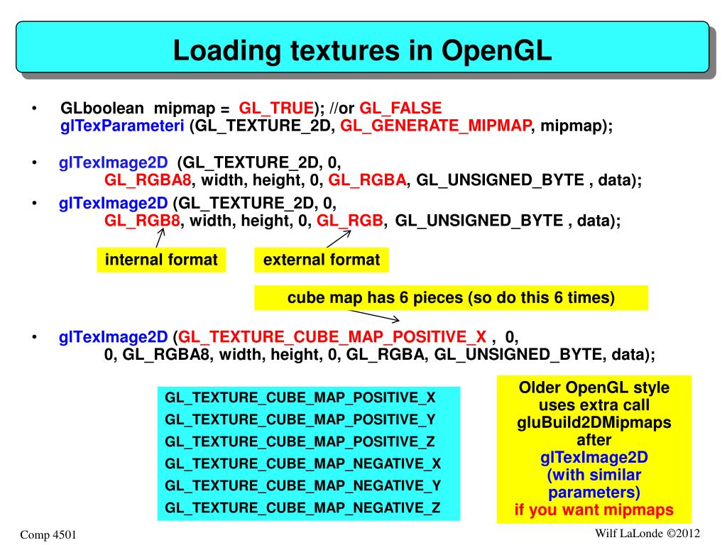 Loading textures in OpenGL • GLbooleanmipmap = GL_TRUE); //or GL_FALSEglTexParameteri (GL_TEXTURE_2D, GL_GENERATE_MIPMAP, mipmap); • glTexImage2D (GL_TEXTURE_2D, 0,GL_RGBA8, width, height, 0, GL_RGBA, GL_UNSIGNED_BYTE , data); • glTexImage2D (GL_TEXTURE_2D, 0, GL_RGB8, width, height, 0, GL_RGB, GL_UNSIGNED_BYTE , data); • glTexImage2D (GL_TEXTURE_CUBE_MAP_POSITIVE_X , 0, 0, GL_RGBA8, width, height, 0, GL_RGBA, GL_UNSIGNED_BYTE, data); internal format external format cube map has 6 pieces (so do this 6 times) Older OpenGL style uses extra call gluBuild2DMipmapsafterglTexImage2D(with similar parameters) if you want mipmaps GL_TEXTURE_CUBE_MAP_POSITIVE_X GL_TEXTURE_CUBE_MAP_POSITIVE_Y GL_TEXTURE_CUBE_MAP_POSITIVE_Z GL_TEXTURE_CUBE_MAP_NEGATIVE_X GL_TEXTURE_CUBE_MAP_NEGATIVE_Y GL_TEXTURE_CUBE_MAP_NEGATIVE_Z