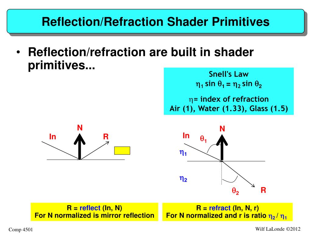 Shader Functions float fresnelRatio (float bias, float scale, float power, float3 incidentRay, float3 normal) { return clamp01 (bias + scale * pow (1.0 + dot (incidentRay, normal), power)); } float waterFresnelRatio (float3 incidentRay, float3 normal) { return fresnelRatio (0.6, 0.8, 6.0, incidentRay, normal);} float3 refract (float3 incidentRay, float3normal, float3 indexOfRefractionRatio) { //This is chromatic refract. The compiler will choose this “refract” method if a //float3 index of refraction ratio is provided instead of a single float... return float3 ( refract (incidentRay, normal, indexOfRefractionRatio .x), refract (incidentRay, normal, indexOfRefractionRatio .y), refract (incidentRay, normal, indexOfRefractionRatio .z));} shiny car: bias=0.05 scale=0.95 power=3.0glass: bias=0.04 scale=1.0 power=2.0water: bias=0.6 scale=0.8 power=6.0