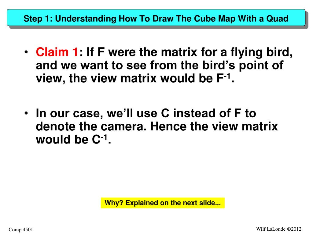 Step 1: Understanding How To Draw The Cube Map With a Quad • Claim 1: If F were the matrix for a flying bird, and we want to see from the bird’s point of view, the view matrix would be F-1. • In our case, we’ll use C instead of F to denote the camera. Hence the view matrix would be C-1. Why? Explained on the next slide...