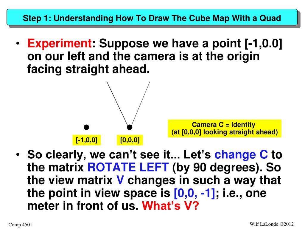 Step 1: Understanding How To Draw The Cube Map With a Quad • Experiment: Suppose we have a point [-1,0.0] on our left and the camera is at the origin facing straight ahead. • So clearly, we can’t see it... Let’s changeC to the matrix ROTATE LEFT (by 90 degrees). So the view matrix V changes in such a way that the point in view space is [0,0, -1]; i.e., one meter in front of us. What’s V? Camera C = Identity (at [0,0,0] looking straight ahead) [-1,0,0] [0,0,0]