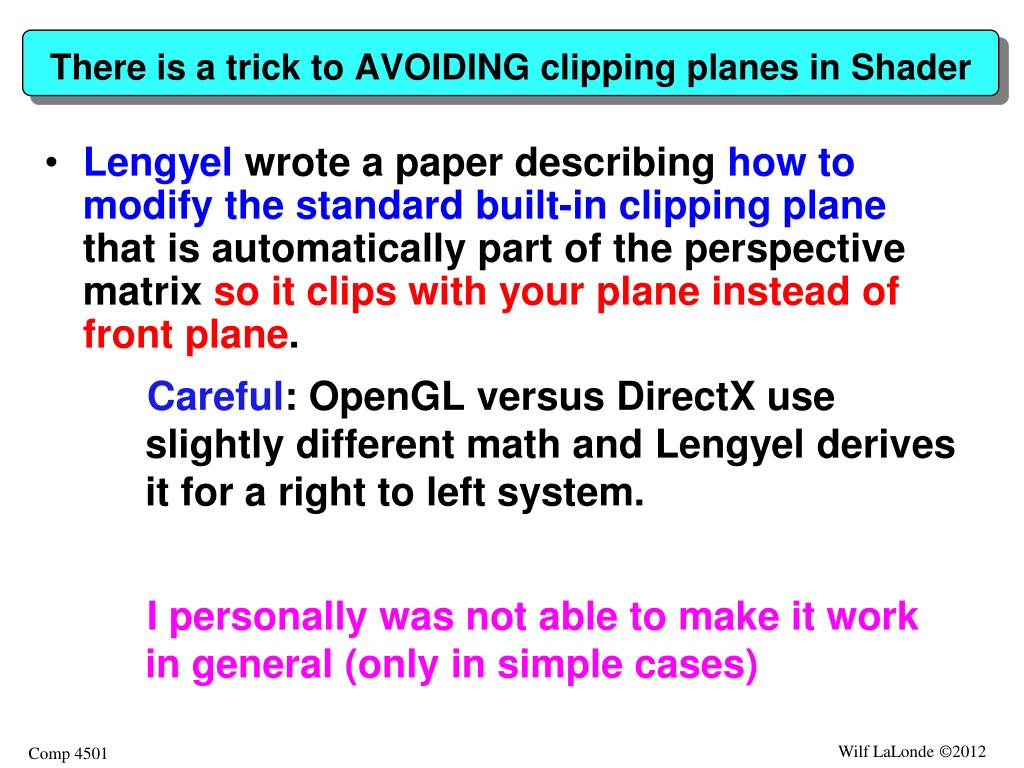 There is a trick to AVOIDING clipping planes in Shader • Lengyel wrote a paper describing how to modify the standard built-in clipping plane that is automatically part of the perspective matrix so it clips with your plane instead of front plane. • Careful: OpenGL versus DirectX use slightly different math and Lengyel derives it for a right to left system. • I personally was not able to make it work in general (only in simple cases)