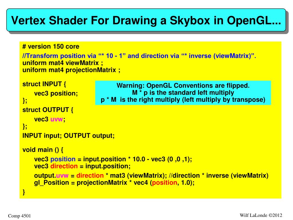 Vertex Shader For Drawing a Skybox in OpenGL... # version 150 core //Transform position via “* 10 - 1” and direction via “* inverse (viewMatrix)”.uniform mat4 viewMatrix ;uniform mat4 projectionMatrix ; struct INPUT { vec3 position;}; struct OUTPUT { vec3 uvw;}; INPUT input; OUTPUT output; void main () { vec3 position = input.position * 10.0 - vec3 (0 ,0 ,1); vec3 direction = input.position; output.uvw = direction * mat3 (viewMatrix); //direction * inverse (viewMatrix)gl_Position = projectionMatrix * vec4 (position, 1.0); } Warning: OpenGL Conventions are flipped. M * p is the standard left multiplyp * M is the right multiply (left multiply by transpose)