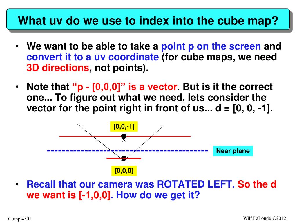 What uv do we use to index into the cube map? • We want to be able to take a point p on the screen and convert it to a uv coordinate (for cube maps, we need 3D directions, not points). • Note that “p - [0,0,0]” is a vector. But is it the correct one... To figure out what we need, lets consider the vector for the point right in front of us... d = [0, 0, -1]. • Recall that our camera was ROTATED LEFT. So the d we want is [-1,0,0]. How do we get it? [0,0,-1] Near plane [0,0,0]