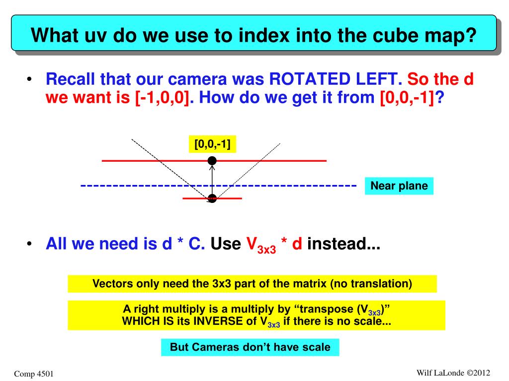 What uv do we use to index into the cube map? • Recall that our camera was ROTATED LEFT. So the d we want is [-1,0,0]. How do we get it from [0,0,-1]? • All we need is d * C. Use V3x3 * d instead... [0,0,-1] Near plane Vectors only need the 3x3 part of the matrix (no translation) A right multiply is a multiply by “transpose (V3x3)” WHICH IS its INVERSE of V3x3 if there is no scale... But Cameras don’t have scale