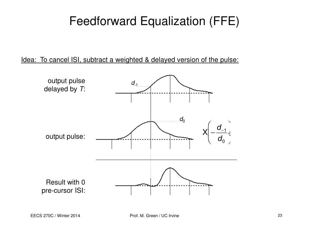 Feedforward Equalization (FFE) Idea: To cancel ISI, subtract a weighted & delayed version of the pulse: output pulse delayed by T: d-1 d0 output pulse: Result with 0 pre-cursor ISI: Prof. M. Green / UC Irvine 23