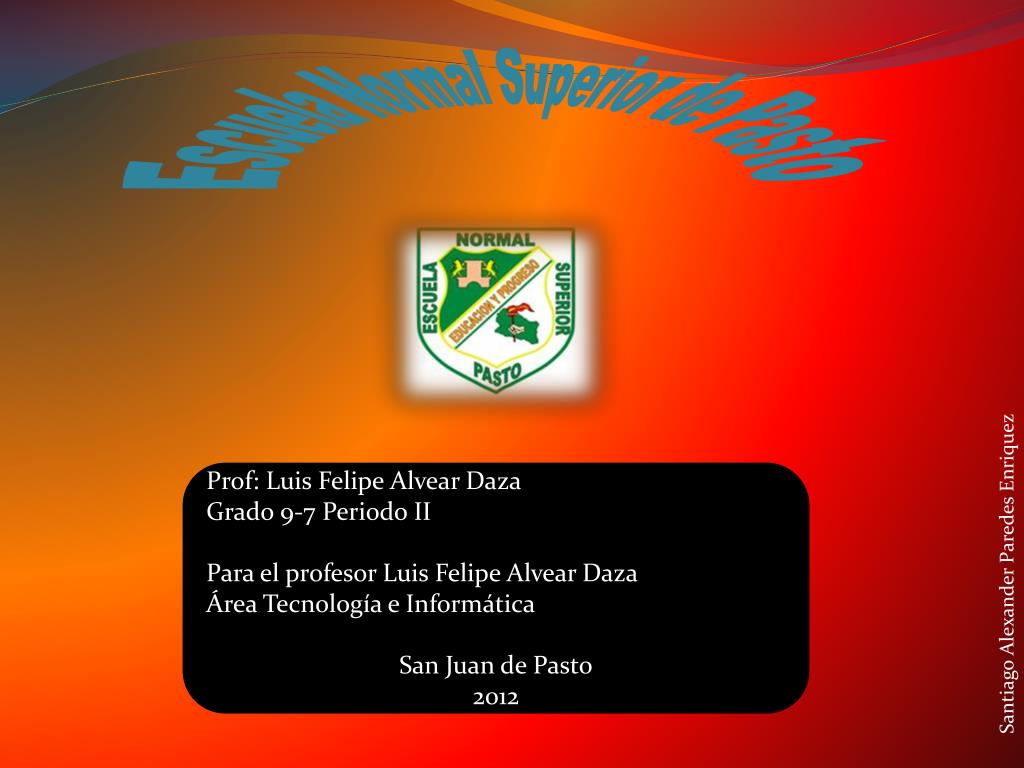 Escuela Normal Superior de Pasto. Prof : Luis Felipe Alvear Daza Grado 9-7 Periodo II Para el profesor Luis Felipe Alvear Daza Área Tecnología e Informática San Juan de Pasto 2012. Santiago Alexander Paredes Enriquez.