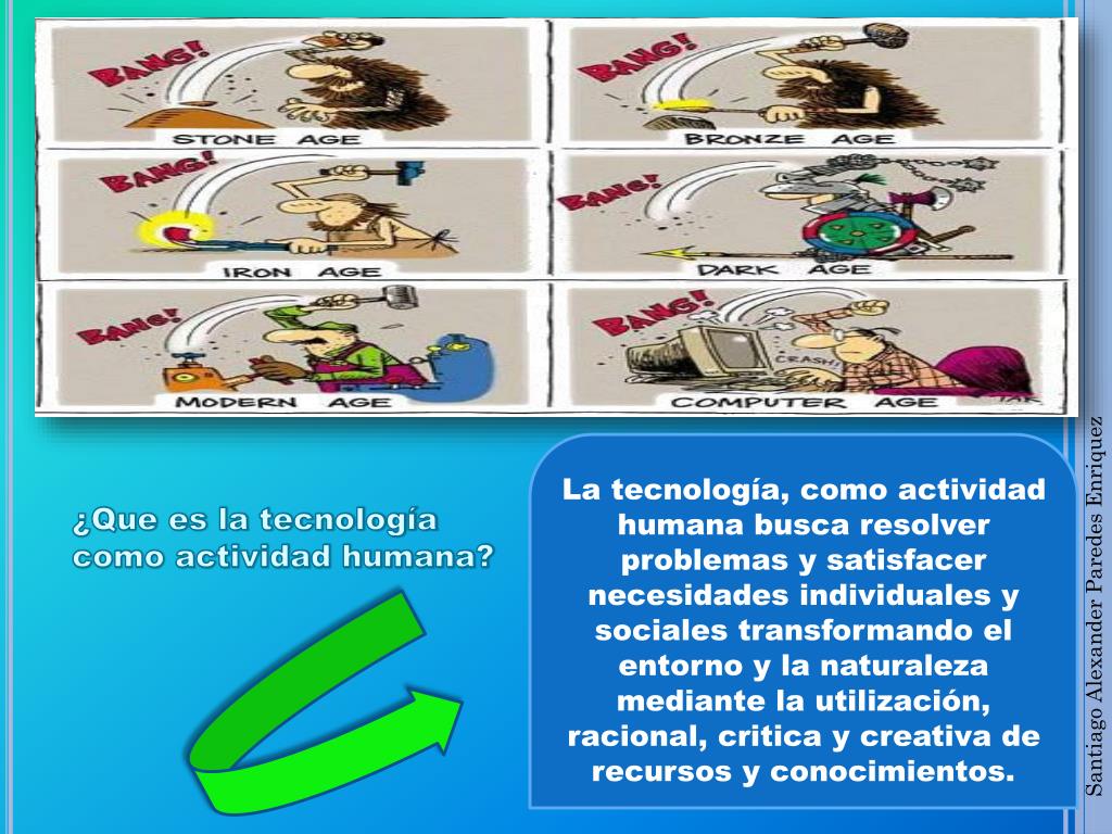 La tecnología, como actividad humana busca resolver problemas y satisfacer necesidades individuales y sociales transformando el entorno y la naturaleza mediante la utilización, racional, critica y creativa de recursos y conocimientos. ¿Que es la tecnología como actividad humana? Santiago Alexander Paredes Enriquez