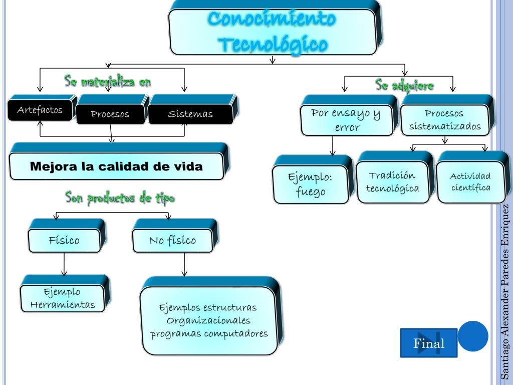 Conocimiento Tecnológico Se materializa en Se adquiere Artefactos Procesos Sistemas Por ensayo y error Procesos sistematizados Mejora la calidad de vida Tradición tecnológica Actividad científica Ejemplo: fuego Son productos de tipo Físico No físico Santiago Alexander Paredes Enriquez Ejemplo Herramientas Ejemplos estructuras Organizacionales programas computadores Final