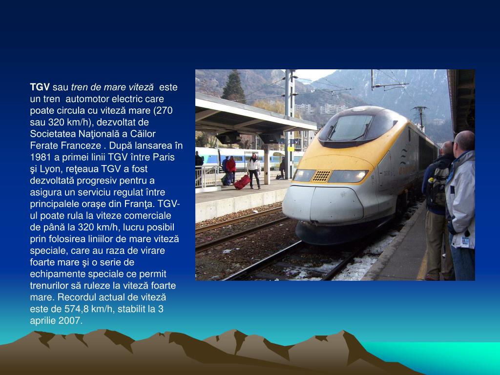 TGV sau tren de mare viteză este un tren automotor electric care poate circula cu viteză mare (270 sau 320 km/h), dezvoltat de Societatea Naţională a Căilor Ferate Franceze . După lansarea în 1981 a primei linii TGV între Paris şi Lyon, reţeaua TGV a fost dezvoltată progresiv pentru a asigura un serviciu regulat între principalele oraşe din Franţa. TGV-ul poate rula la viteze comerciale de până la 320 km/h, lucru posibil prin folosirea liniilor de mare viteză speciale, care au raza de virare foarte mare şi o serie de echipamente speciale ce permit trenurilor să ruleze la viteză foarte mare. Recordul actual de viteză este de 574,8 km/h, stabilit la 3 aprilie 2007.
