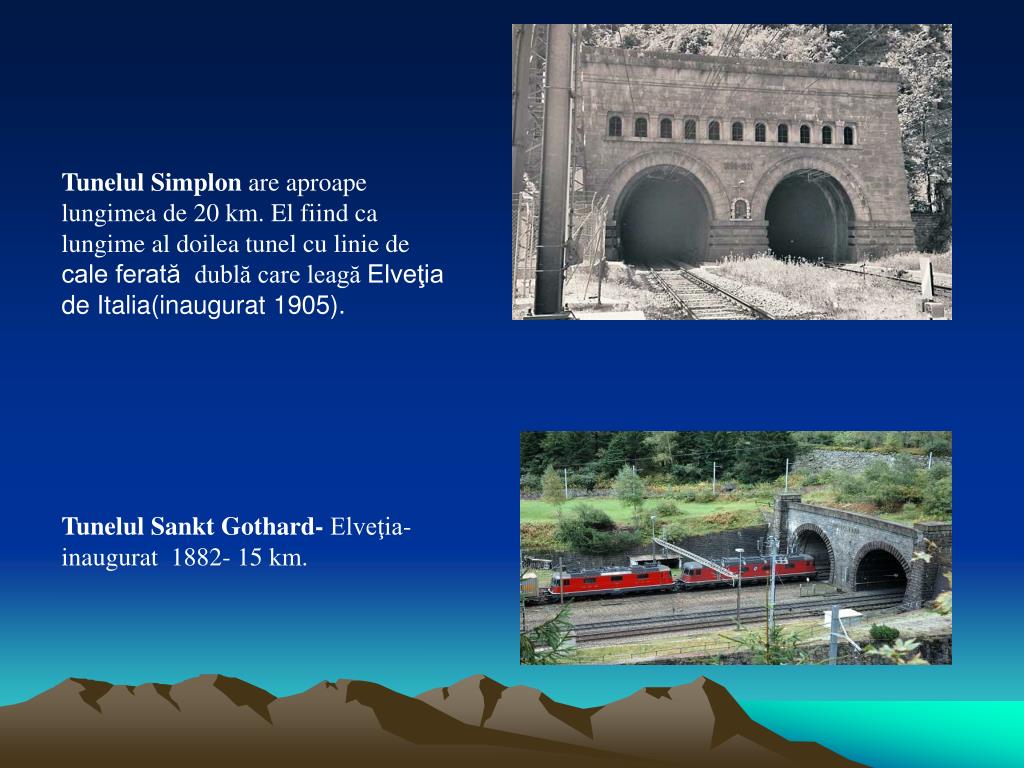 Tunele feroviare montane Un tunel ce măsoară 34,6 kilometri şi trece pe sub Munţii Alpi a fost inaugurat în iunie 2007 Elvetia. Tunelul Loetschberg începe în localitatea Frutigen, din cantonul Berna, şi se termină în Raron, în cantonul Valais. Acesta este cel mai lung tunel de cale ferată din lume şi scurtează timpul unei călăatorii cu trenul între Germania şi Italia cu cel puţin două ore.Constructia tunelului a durat opt ani şi a costat,în total, 2,6 miliarde de euro.