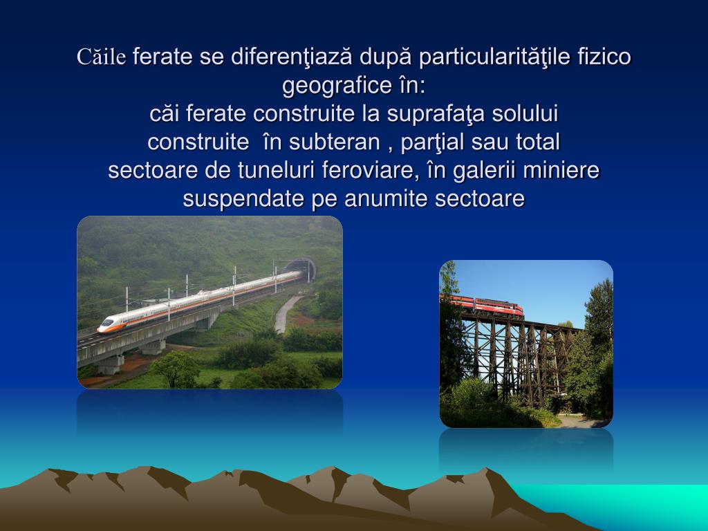 Căile ferate se diferenţiază după particularităţile fizico geografice în: căi ferate construite la suprafaţa soluluiconstruite în subteran , parţial sau totalsectoare de tuneluri feroviare, în galerii minieresuspendate pe anumite sectoare