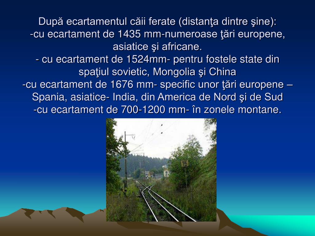 După ecartamentul căii ferate (distanţa dintre şine):-cu ecartament de 1435 mm-numeroase ţări europene, asiatice şi africane.- cu ecartament de 1524mm- pentru fostele state din spaţiul sovietic, Mongolia şi China-cu ecartament de 1676 mm- specific unor ţări europene – Spania, asiatice- India, din America de Nord şi de Sud-cu ecartament de 700-1200 mm- în zonele montane.