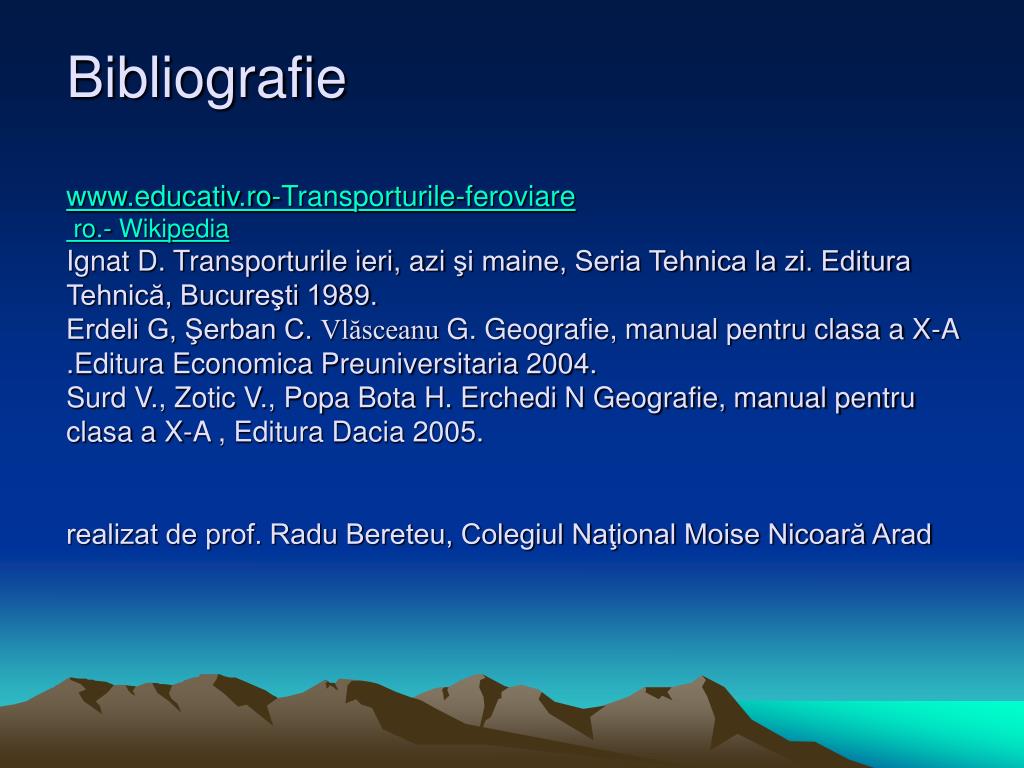 Bibliografiewww.educativ.ro-Transporturile-feroviare ro.- WikipediaIgnat D. Transporturile ieri, azi şi maine, Seria Tehnica la zi. Editura Tehnică, Bucureşti 1989.Erdeli G, Şerban C. Vlăsceanu G. Geografie, manual pentru clasa a X-A .Editura Economica Preuniversitaria 2004.Surd V., Zotic V., Popa Bota H. Erchedi N Geografie, manual pentru clasa a X-A , Editura Dacia 2005.realizat de prof. Radu Bereteu, Colegiul Naţional Moise Nicoară Arad