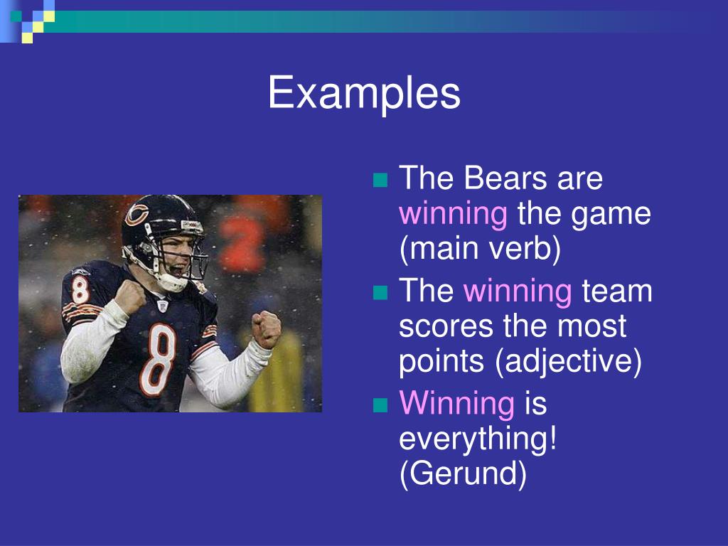 Examples • The Bears are winning the game (main verb) • The winning team scores the most points (adjective) • Winning is everything! (Gerund)