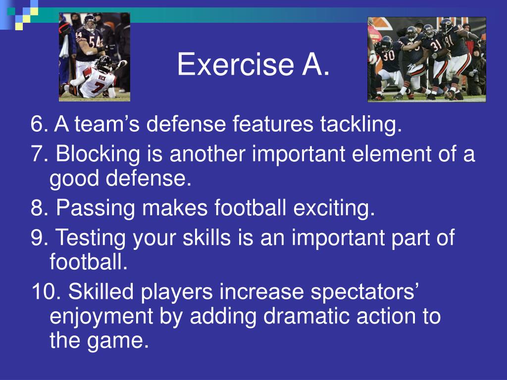 Exercise A. 6. A team’s defense features tackling. 7. Blocking is another important element of a good defense. 8. Passing makes football exciting. 9. Testing your skills is an important part of football. 10. Skilled players increase spectators’ enjoyment by adding dramatic action to the game.