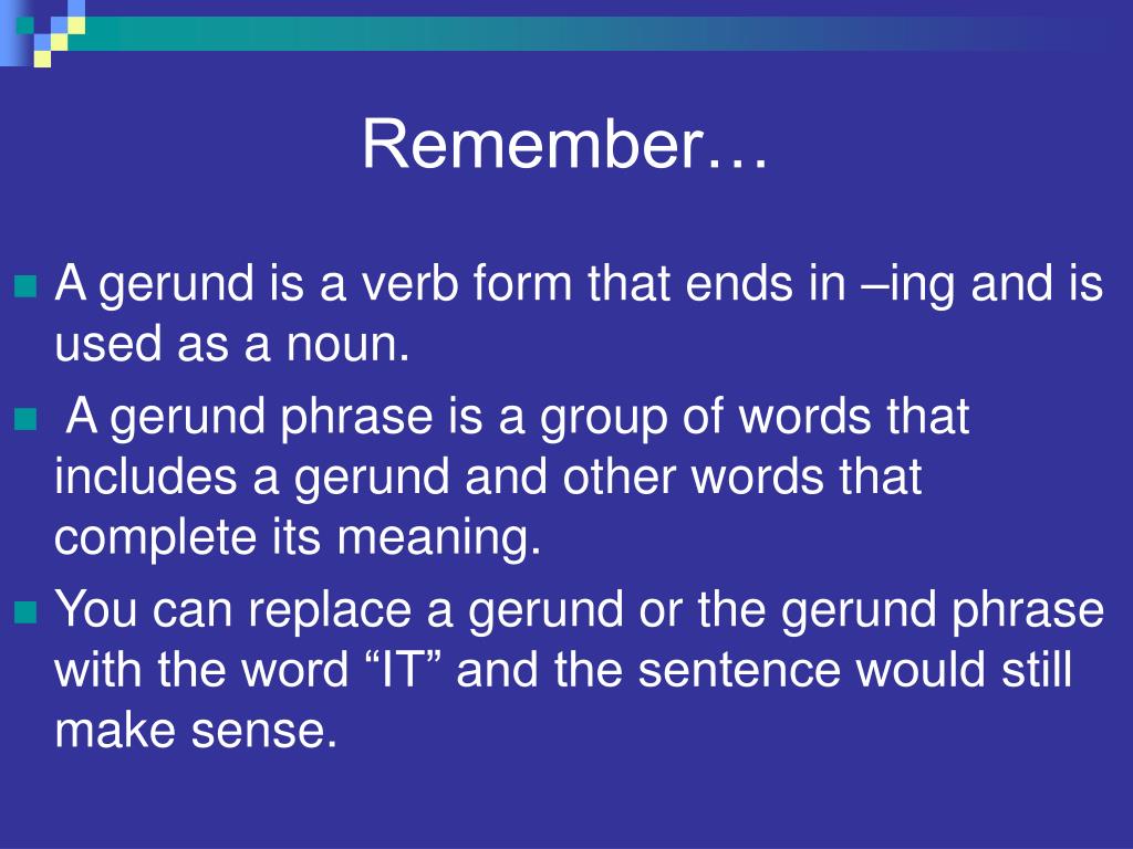 Remember… • A gerund is a verb form that ends in –ing and is used as a noun. • A gerund phrase is a group of words that includes a gerund and other words that complete its meaning. • You can replace a gerund or the gerund phrase with the word “IT” and the sentence would still make sense.