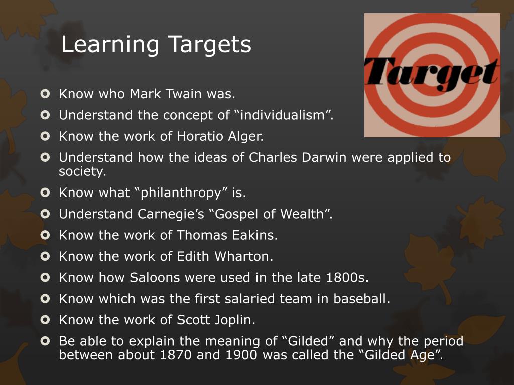 Learning Targets • Know who Mark Twain was. • Understand the concept of “individualism”. • Know the work of Horatio Alger. • Understand how the ideas of Charles Darwin were applied to society. • Know what “philanthropy” is. • Understand Carnegie’s “Gospel of Wealth”. • Know the work of Thomas Eakins. • Know the work of Edith Wharton. • Know how Saloons were used in the late 1800s. • Know which was the first salaried team in baseball. • Know the work of Scott Joplin. • Be able to explain the meaning of “Gilded” and why the period between about 1870 and 1900 was called the “Gilded Age”.