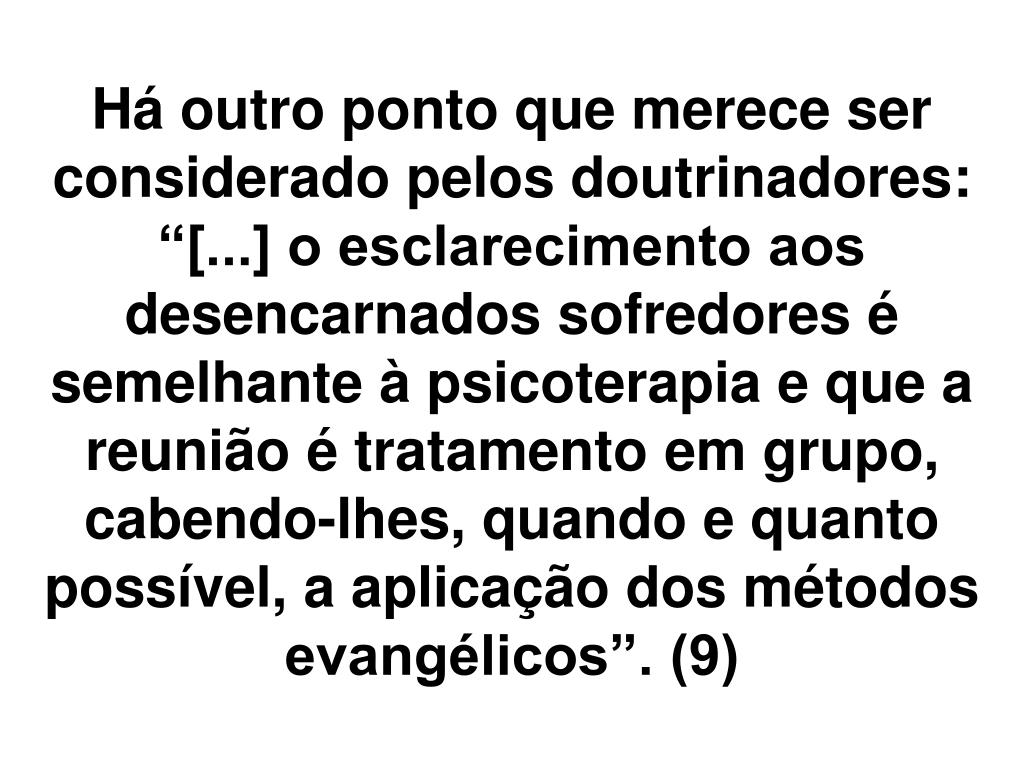 Há outro ponto que merece ser considerado pelos doutrinadores: “[...] o esclarecimento aos desencarnados sofredores é semelhante à psicoterapia e que a reunião é tratamento em grupo, cabendo-lhes, quando e quanto possível, a aplicação dos métodos evangélicos”. (9)