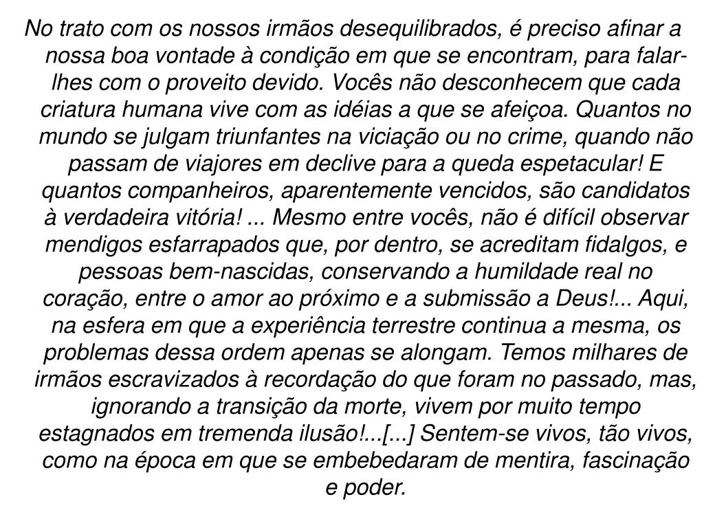No trato com os nossos irmãos desequilibrados, é preciso afinar a nossa boa vontade à condição em que se encontram, para falar-lhes com o proveito devido. Vocês não desconhecem que cada criatura humana vive com as idéias a que se afeiçoa. Quantos no mundo se julgam triunfantes na viciação ou no crime, quando não passam de viajores em declive para a queda espetacular! E quantos companheiros, aparentemente vencidos, são candidatos à verdadeira vitória! ... Mesmo entre vocês, não é difícil observar mendigos esfarrapados que, por dentro, se acreditam fidalgos, e pessoas bem-nascidas, conservando a humildade real no coração, entre o amor ao próximo e a submissão a Deus!... Aqui, na esfera em que a experiência terrestre continua a mesma, os problemas dessa ordem apenas se alongam. Temos milhares de irmãos escravizados à recordação do que foram no passado, mas, ignorando a transição da morte, vivem por muito tempo estagnados em tremenda ilusão!...[...] Sentem-se vivos, tão vivos, como na época em que se embebedaram de mentira, fascinação e poder.