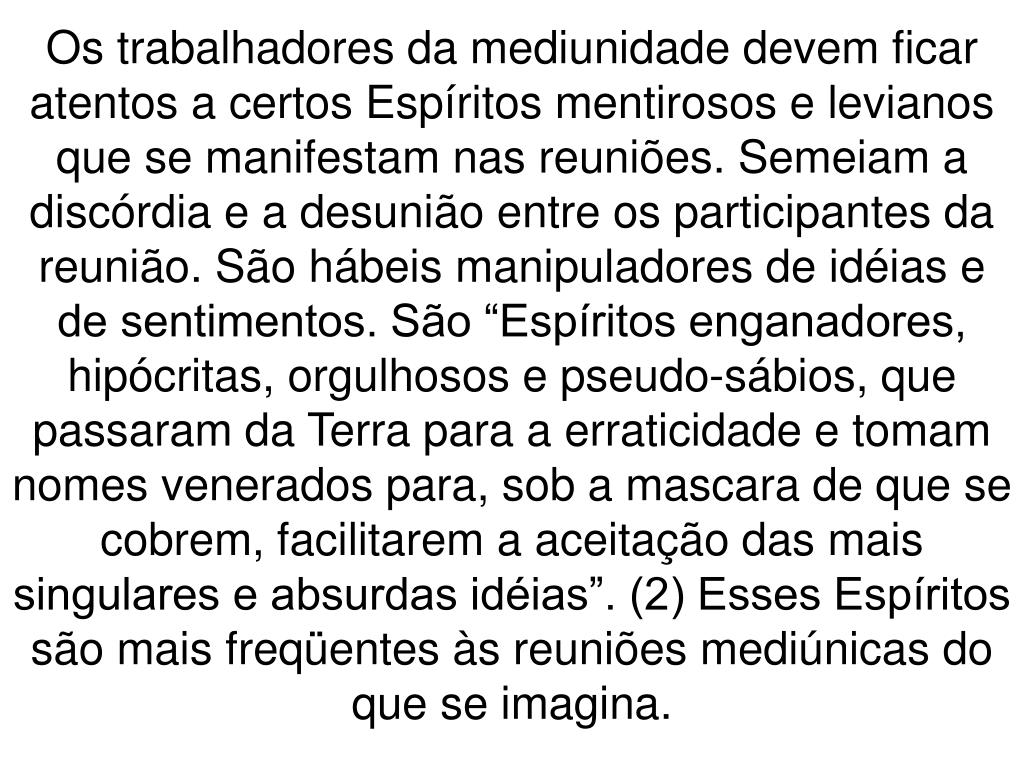 Os trabalhadores da mediunidade devem ficar atentos a certos Espíritos mentirosos e levianos que se manifestam nas reuniões. Semeiam a discórdia e a desunião entre os participantes da reunião. São hábeis manipuladores de idéias e de sentimentos. São “Espíritos enganadores, hipócritas, orgulhosos e pseudo-sábios, que passaram da Terra para a erraticidade e tomam nomes venerados para, sob a mascara de que se cobrem, facilitarem a aceitação das mais singulares e absurdas idéias”. (2) Esses Espíritos são mais freqüentes às reuniões mediúnicas do que se imagina.